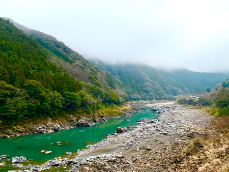 View of the Hozu River on a warm, Spring day in Arashiyama, Japan.