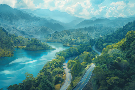 Going on a road trip, aerial view of a winding mountain road, lush green forests, and serene blue lakes, watercolor style, vivid colors, highly detailed, inviting and peaceful