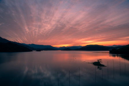 Mesmerizing sunset view of the lake that reflects the mountains