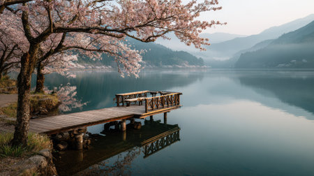 A small wooden dock extending into a misty lake, cherry blossoms lining the shore, distant mountains reflected in the glassy water, peaceful and inviting