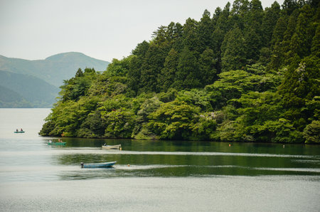 Serene lake with boats beneath lush forested hills in Hakone, Japan.