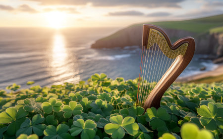 Harp in Clover Sunset Ocean View Irish Music Scene Sky Calm Green Beach Cliff Water Waves