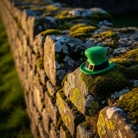 Leprechaun hat on a green mossy stone wall
