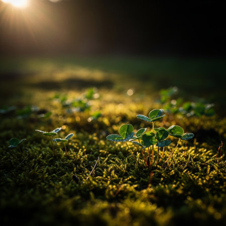 Lush green clovers growing on a sunlit pathway, creating a serene natural ambiance perfect for seasonal themes and nature photography
