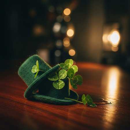 Green hat and shamrock on a vibrant green background for St. Patrick's Day celebration. This festive image symbolizes Irish culture and tradition, ideal for holiday cards, posters, and digital designs.