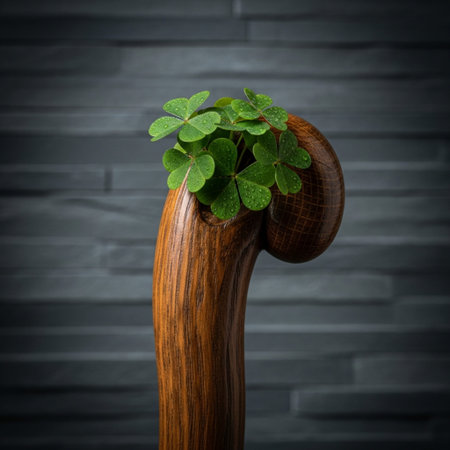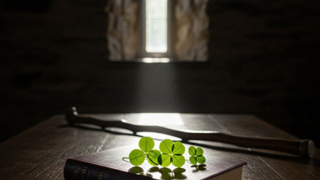 Lush green four-leaf clover on weathered wooden table closeup. Floral St Patrick holiday symbol of luck and happiness. Irish culture