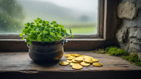 four-leaf clover and coins for St. Patrick's Day