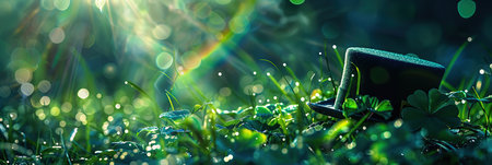 Rainbow over Green grass with clover leaves and a St. Patrick hat on a bokeh background