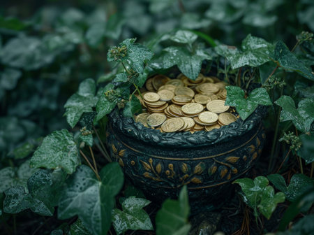a pot of coins sitting on top of leaves.