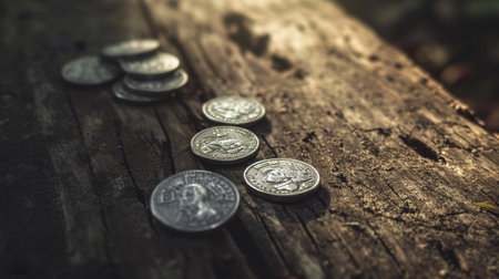 This stunning close-up image features a pile of vintage coins on a rustic surface, emphasizing their distinct textures and intricate details. Perfect for finance themes.