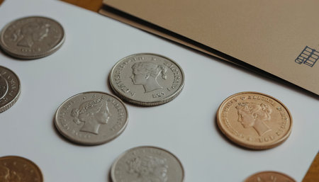 Close-up of a group of one pound coina on a wooden table, with copy space