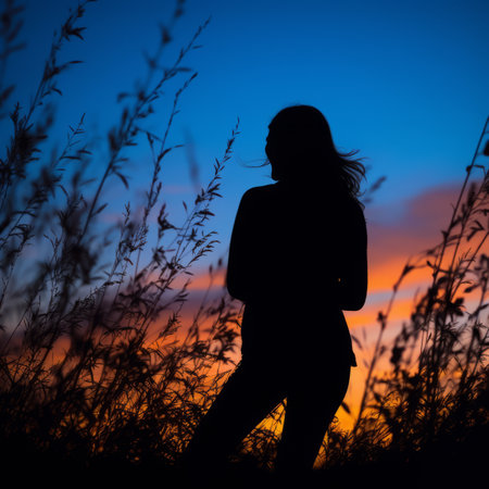 silhouette of a woman standing in tall grass at sunset