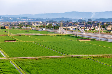 Aerial view of the railway tracks and rice fields in the countryside