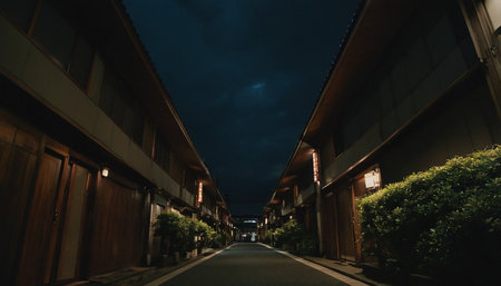 A narrow, quiet alleyway in Japan lined with traditional houses and potted plants