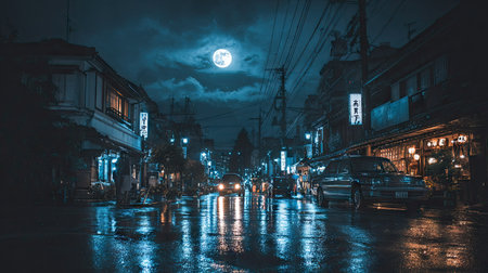 A nighttime street scene displays reflections on a wet road, showcasing a bright moon overhead. The composition includes buildings with illuminated windows, cars, and ambient streetlights creating a dark, atmospheric environment. It offers visual elements potentially suitable for various commercial or editorial applications.