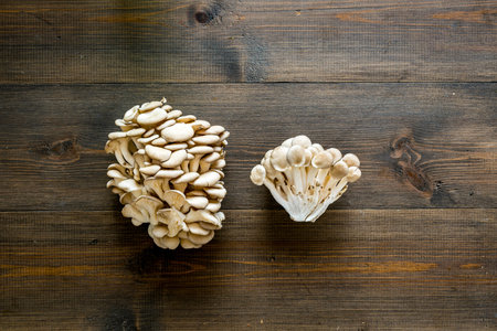 Raw white shimeji mushrooms on a wooden table. Top view.