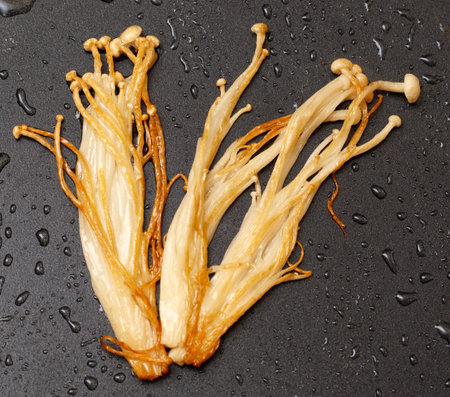 Golden brown and white Asian Enoki mushrooms, vegetable background, fungus