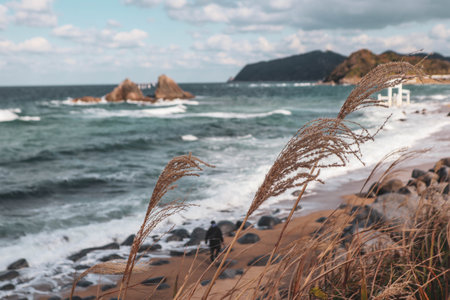 A scenic view of the ocean with gentle waves, tall grasses swaying in the wind, and a vibrant blue sky filled with fluffy clouds. Perfect nature and seasonal background.