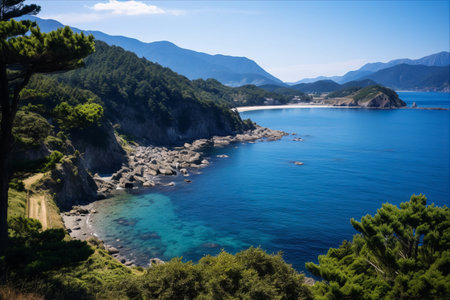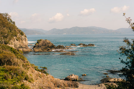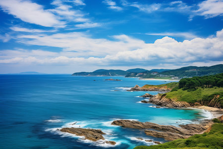Beautiful blue sky and green and natural scenery of the sea in Kitanagato Coast Quasi-National Park