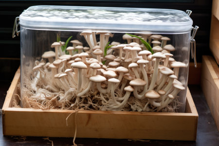 oyster mushrooms sprouting in a diy grow kit, created with generative ai