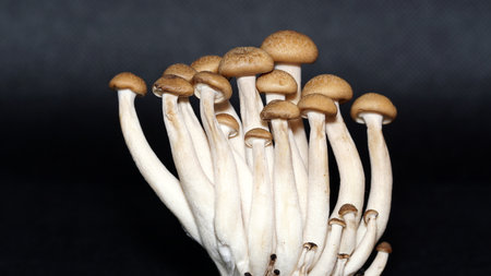 fresh brown shimeji mushroom, beech mushroom or edible mushroom on dark background