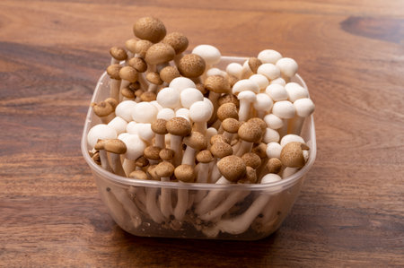 White and brown shimeji edible mushrooms native to East Asia, buna-shimeji is widely cultivated and rich in umami tasting compounds