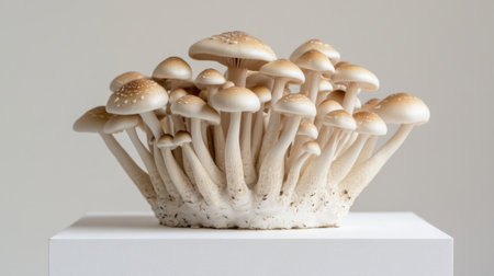 A cluster of Shimeji mushrooms arranged artistically on a pristine white surface, creating a balanced and aesthetically pleasing layout.