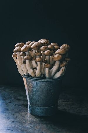 Cluster or bunch of clamshell mushrooms, also known as shimeji or brown beech mushrooms against a dark background with dramatic shadows