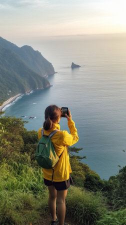 Generative AI : Traveller backpacker girl on the top of the mountain looking at the ocean