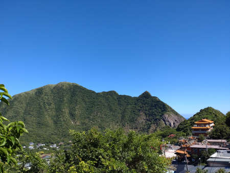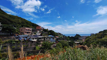 A mountain village facing the sea. A romantic and quiet afternoon view. Looking at the mountain city of Jiufen from Badouzi in Keelung. Taiwan