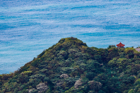 Dragon head hill at Yongmeori Coast, view from Bomunsa temple, Jeju Island, South Korea.