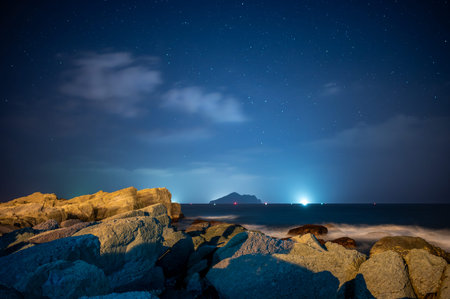 Fishing boat lights on the seaside, dynamic clouds in the sky. Guishan Island(Turtle Island) is a volcanic island in the Pacific Ocean. Taiwan
