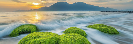 Sunrise over Tranquil Sea , Waves Crashing on Lush Green Rocks of Serenity Long Exposure Coast.