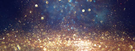 background of abstract glitter lights. gold, blue and black. de focused