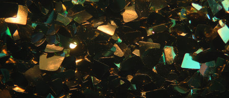 Close-up of glass shards reflecting a faint, moody darklight, creating patterns of color and shadow on a dark background.