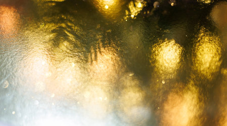 Soft, out of focus bokeh lights in golden yellow and blue tones are scattered across a dark, textured glitter background, with a bright lens flare adding a highlight.