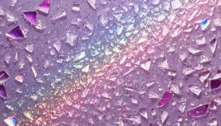 A stunning holographic background with glass shard textures, enhanced by vibrant rainbow reflexes in pink and purple hues, perfect for modern design projects and artistic inspiration.