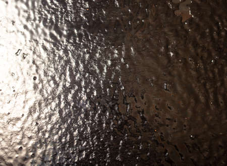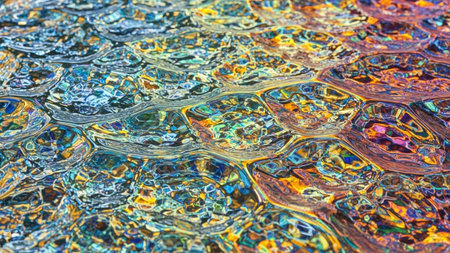 Reflective surface displays glossy petroleum with intricate textures and vibrant light interplay, showing a captivating spectrum of colors.