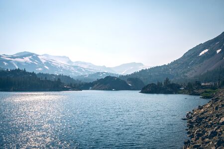 Panoramic view with a lake and snowy mountains. Glacier Point, Yosemite National Park. National park in Sierra Nevada, mountains of Nothern California
