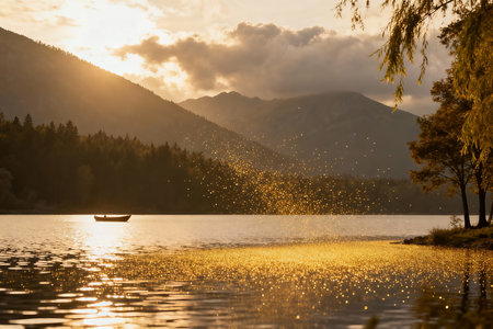 reflection of sparkling light on the waves of a lake, created with generative ai