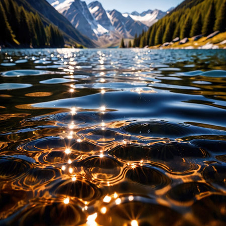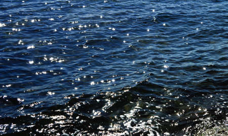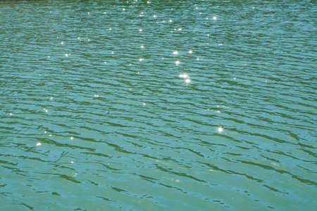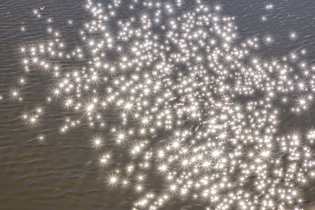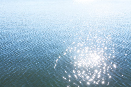 A beautiful close-up of water surface illuminated by sunlight creates sparkling reflections and gentle waves, providing a tranquil and serene atmosphere perfect for relaxation.