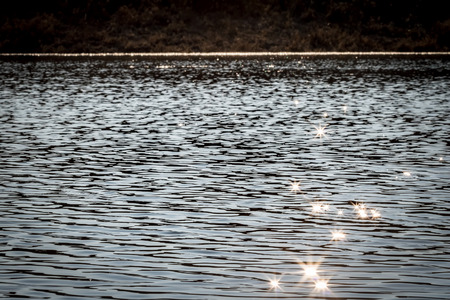 Large rippled water surface of a lake with lots of small waves and sun star shape flares