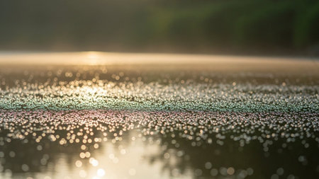 Water showing golden sunrise mist on water surface with bokeh effect and blurred green trees in background.