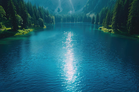 Tranquil Turquoise Lake Sparkles With Sunlight and Mountain Reflections, Perfect Background