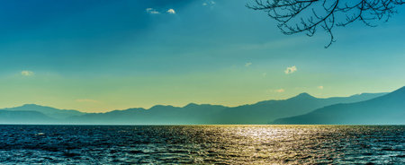 Panorama of Lake Garda in Italy at sunset with silhouettes of mountains