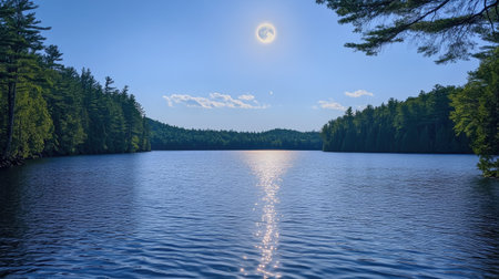 The full moonaes light bathes the clear blue sky, highlighting the gentle waves of a vast, serene lake surrounded by trees.