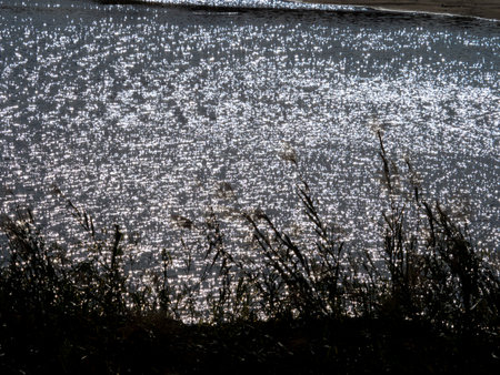 Reeds on the riverbed swaying in the wind and the glittering water surface
