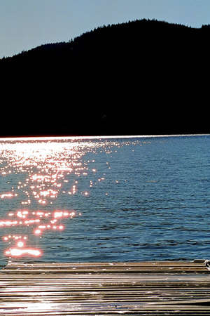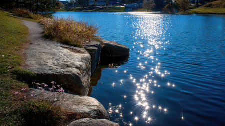 A stunning view of a serene lake featuring sparkling sunlight reflecting on water, framed by rocky shores and vibrant flora, ideal for relaxation and nature lovers.