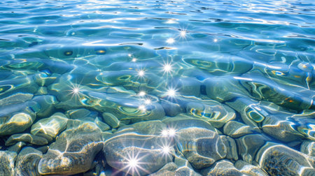 A serene image showcasing a clear water surface adorned with sparkling reflections, revealing colorful pebbles underneath, ideal for nature-themed projects.