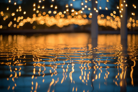 A Christmas party held at a summer swimming pool reflects blue water and creates an abstract background with a blurred bokeh effect and shimmering night lights